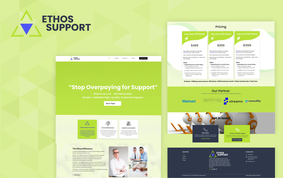 The UI/UX design for EthosSupport is built around clarity, reliability, and modern professionalism to reflect the brand’s promise of simple and high-quality customer support. The interface uses a clean, corporate-inspired layout with bold typography and structured sections that communicate trust and efficiency.
