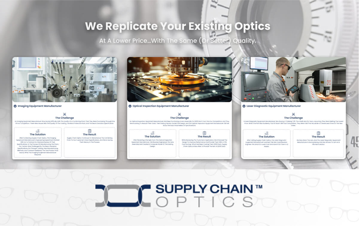 Supply Chain Optics (founded as Balboa Scientific) has been serving manufacturers with the highest quality optical components at the lowest possible prices. We have a proven track-record of helping buyers reduce cost while delivering extremely high levels of customer satisfaction. Most OEM optics buyers purchase a bewildering variety of custom and catalog parts sourced from many different vendors, caused by engineering’s preference of convenience over cost. Fortunately, there is a better way. Supply Chain Optics’ global supply chain of specialty fabricators is usually able to produce all the parts on your BOMs, simplifying purchasing and reducing cost at the same time. Supply Chain Optics is the premier resource for hi-tech instrument manufacturers in North America seeking to reduce the cost of OEM optical and opto-mechanical components while at the same time receiving the required quality, delivery and personalized service & support.