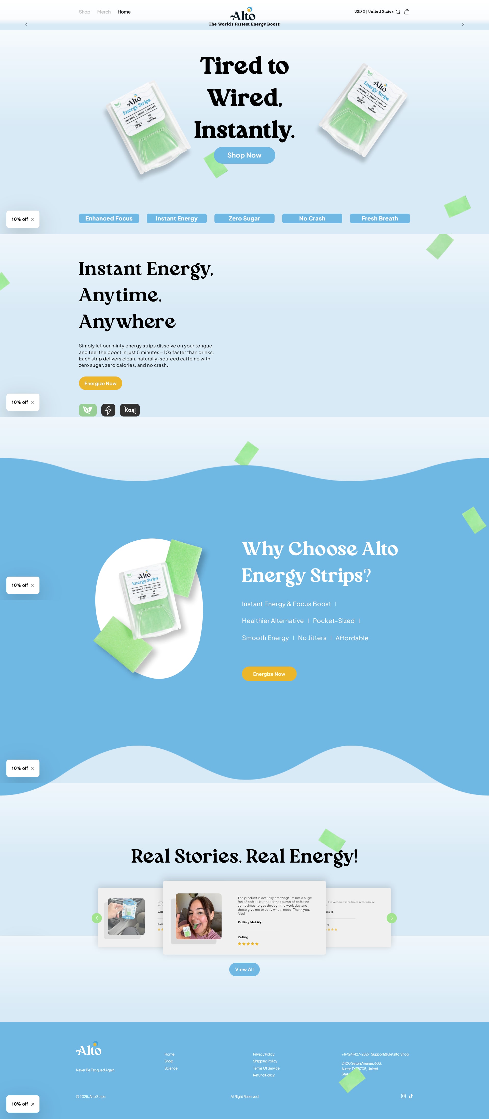 Alto Strips offers instant energy strips designed to provide a quick boost of energy and focus. Each strip contains 80 mg of natural caffeine, delivering effects approximately 10 times faster than traditional energy drinks. These mint-flavored strips are sugar-free, calorie-free, and formulated to prevent energy crashes, making them a convenient alternative to coffee or energy drinks. Additionally, the site features customer testimonials highlighting the effectiveness and convenience of the energy strips.