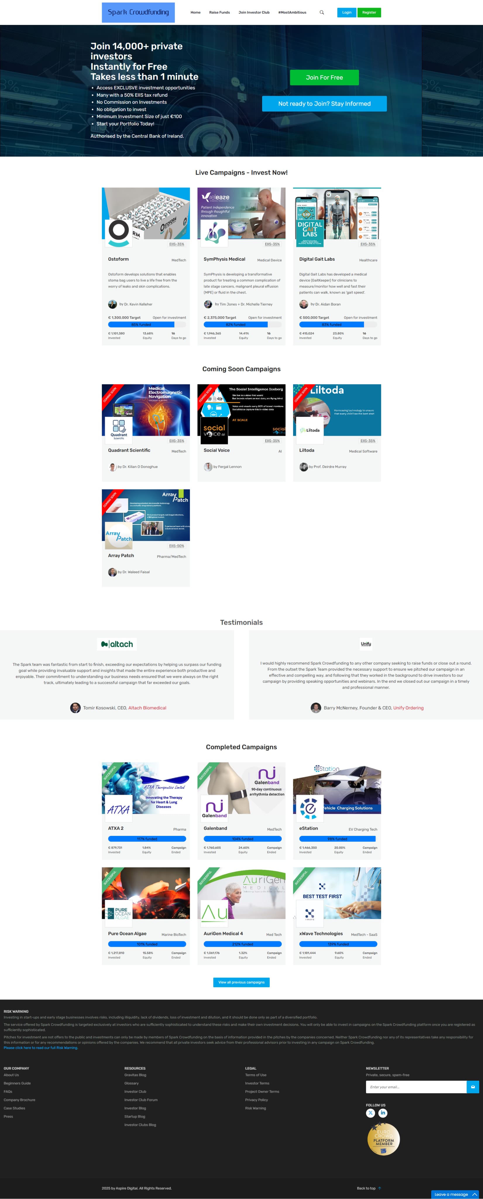 Spark Crowdfunding has established itself as Ireland’s top equity crowdfunding platform, connecting high-potential startups with a thriving community of over 13,000 investors. With over 40 successful funding campaigns, a low investment threshold, sector-specific expertise, and full regulatory authorization from the Central Bank of Ireland, the platform delivers a seamless, scalable, and transparent funding experience. Its global reach, tax-advantaged opportunities, and commitment to innovation have made it a trusted partner for startups and investors worldwide.